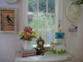 I was requested by one of my customer to make this vignette. She wanted me to prepare small vignette dollhouse to display 'bowl with birds' and 'cats' from her collections. She also requested me to make 'hydrangea flowers'. For rest of the things I used my idea. As I am aware of my customer's love for birds, I decided to display couple of items related to "birds".